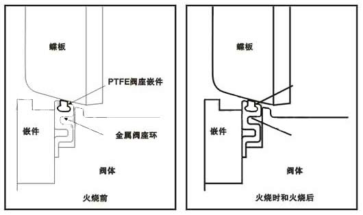 ANSI/FCI 70-2規定了控制閥的泄漏等級和試驗程序。其中VI級為低泄漏等級。高性能對夾式蝶閥能達到規定的無氣泡密封,要高于VI級。 耐火閥座 耐火閥座是考慮在火燒時需要有效關閉時使用的。是以金屬座圈鑲嵌PTFE, PTFE作為首道密封。當PTFE燒壞時,金屬座圈作為第二道密封進行有效的關閉。耐火閥座也適用于關鍵的或嚴峻的使用工況。帶耐火閥座的兩門按API607第4版和BS6755第二部分經過試驗并獲得認可。 |