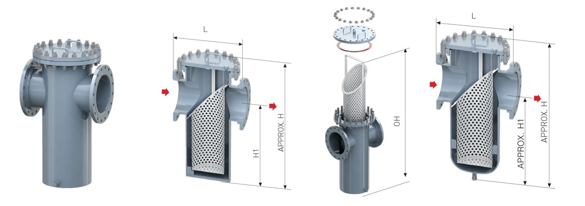 進口直通籃式過濾器的進口出口在一個水平位置上,由一個主單筒與進口出口組成,用于攔截管道介質里的雜質。在生產過程中,流體會隨著管道流經過濾器,液體先通過筒體而后進入濾籃,流體從濾籃中流出直至過濾器的出口排出,其中的固體雜質顆粒為濾籃所阻擋,與流體分離完成過濾。過濾器使用一段時間后,固體雜質在濾籃中堆積,這時只要旋開主管底部的螺塞,將直通過濾器內的液體排凈,拆卸法蘭,清洗過濾籃后重新裝入。