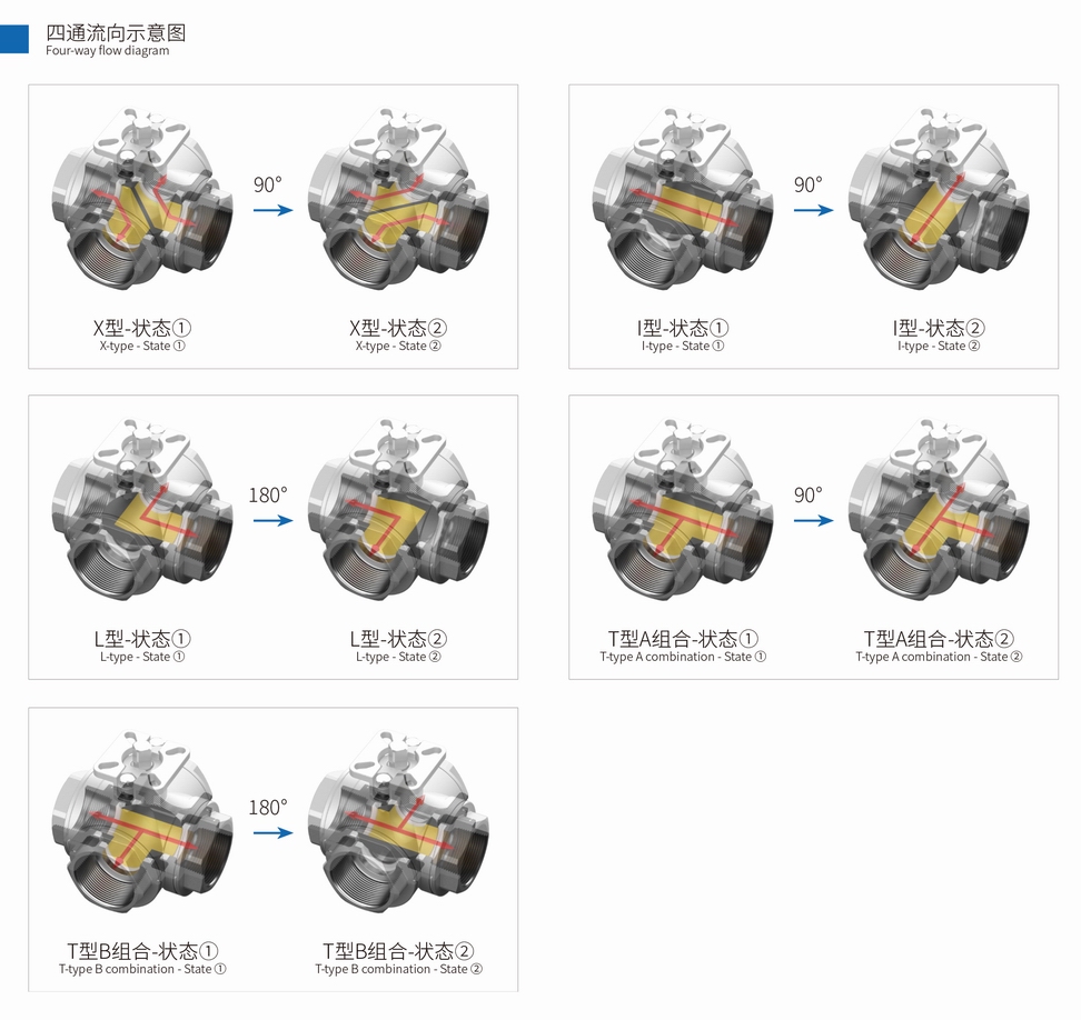 進口三通球閥結構緊湊、外型美觀、密封性能好。也能實現管道中介質流向的切換。也能使相互垂直的兩個通道連通或關閉。F型四閥座密封手動三通球閥造型美觀,結構緊湊合理,它不僅可實現介質流向的切換,也可使三個通道相互連通,同時也可關閉任一通道,使另外兩個通道連通,靈活控制管路中介質的合流或分流。