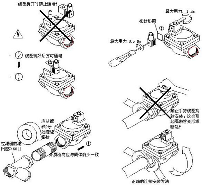 2、安裝時電磁閥線圈向上,并保持垂直位置,電磁閥上箭頭或標(biāo)記應(yīng)與管道流向一致,不得安裝在有濺水或漏水的地方。