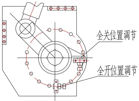(3)蝶閥全開(kāi)位置的調(diào)整(出廠時(shí)已調(diào)好,如有變動(dòng)需重調(diào)):調(diào)整方法見(jiàn)圖(2),先將全開(kāi)位置調(diào)節(jié)螺栓向上調(diào)節(jié),待蝶板全開(kāi)(即活塞桿全部伸出到位)后再將螺栓向下調(diào)節(jié),頂緊連桿消除機(jī)械連接的間隙,然后緊固螺母即可